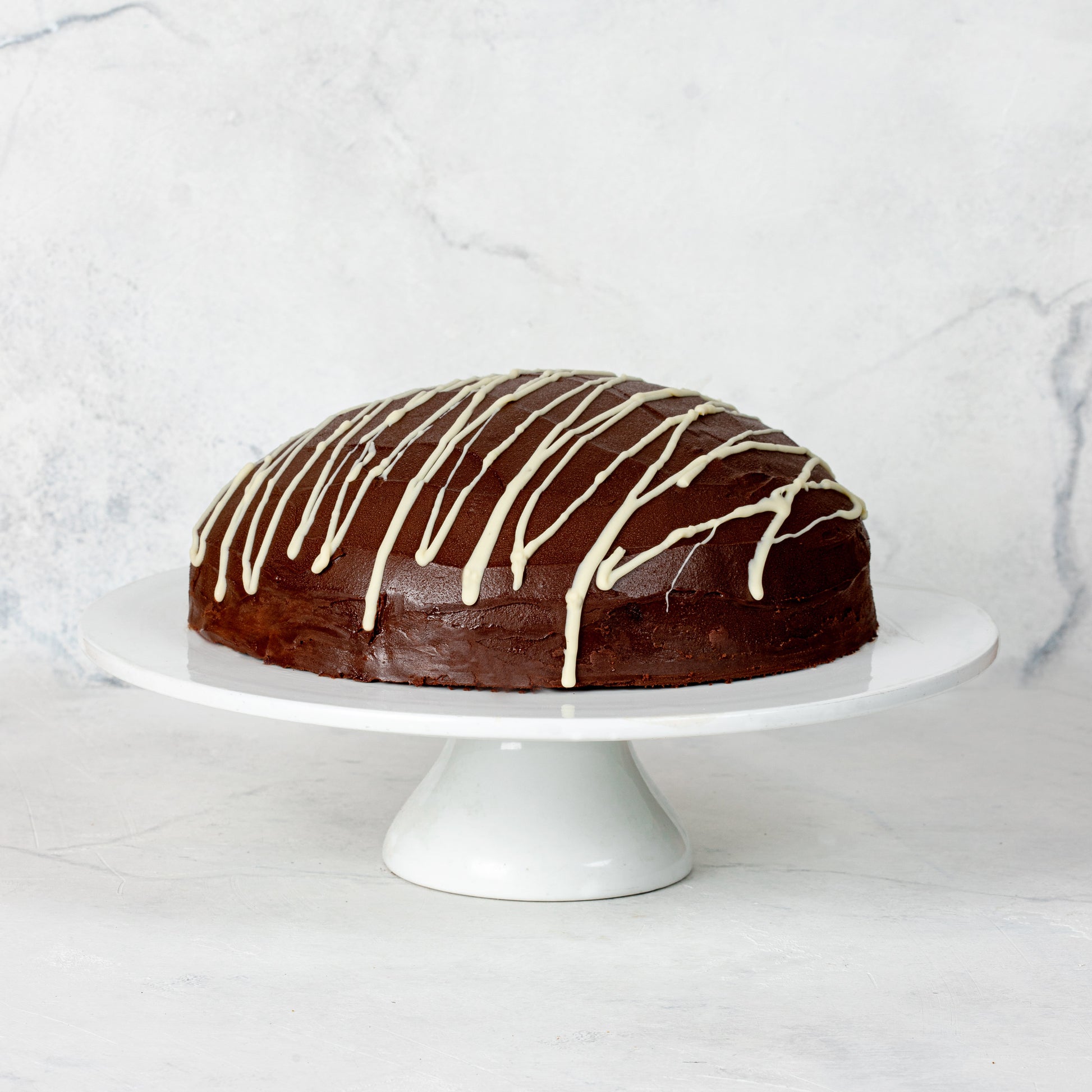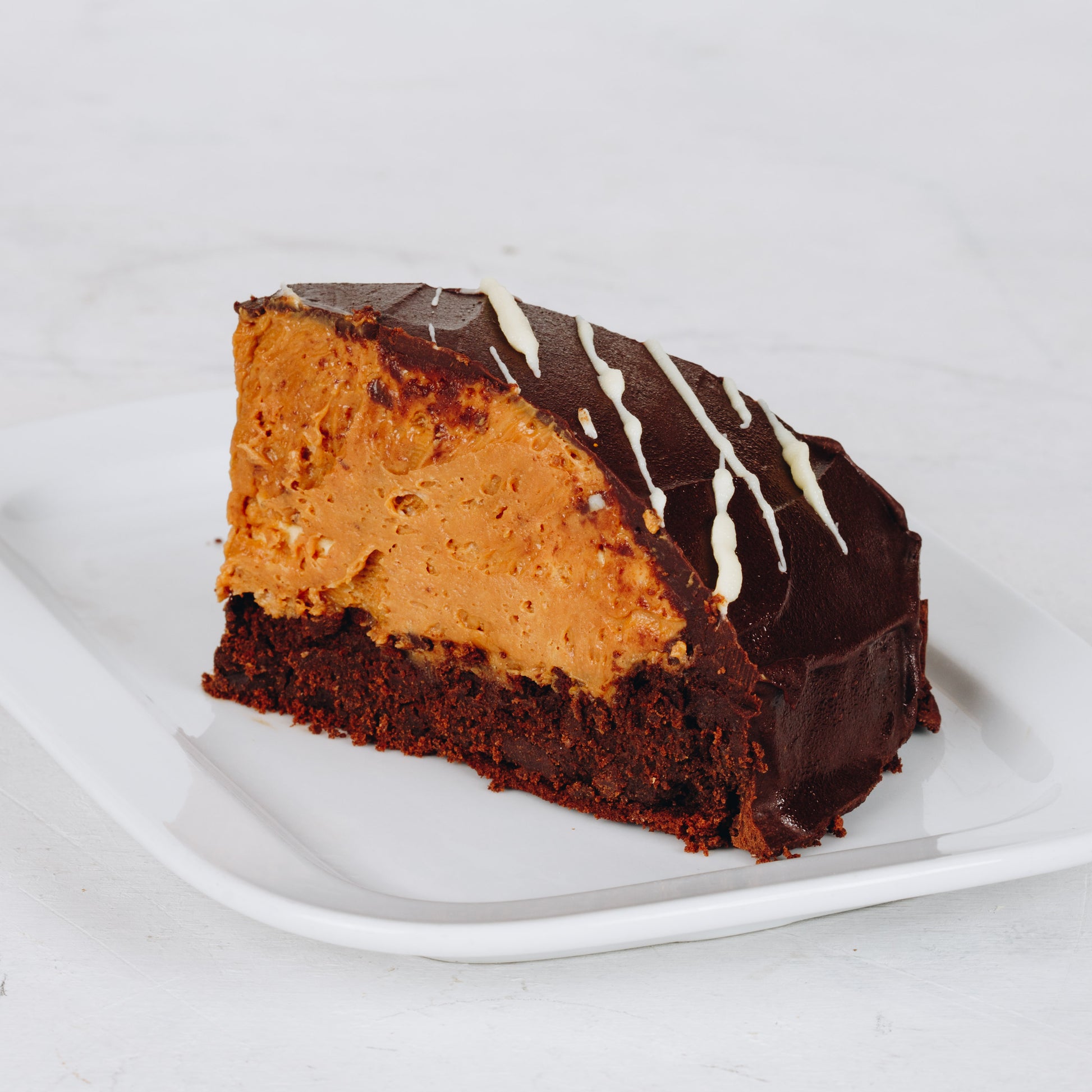 Torta Amadeus, con marquise de chocolate semiamargo, mousse de dulce de leche y ganache de chocolate e hilos de chocolate blanco. - Sin harina -