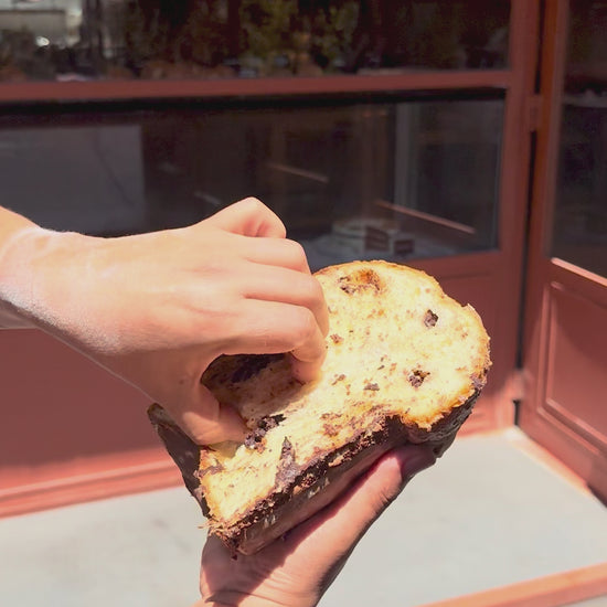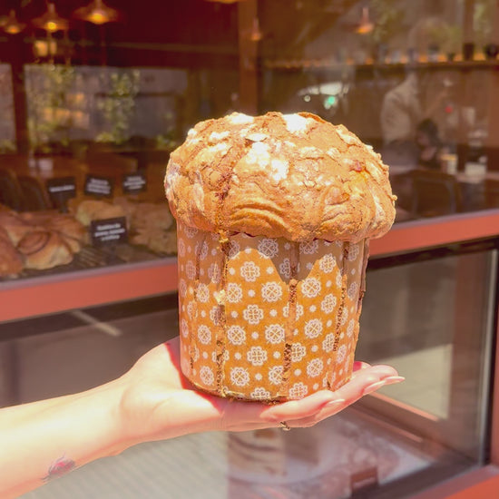 Panettone con chocolate 70% cacao, 100% artesanal y sin conservantes, con harina orgánica, azúcar orgánica y los mejores ingredientes del mercado.
