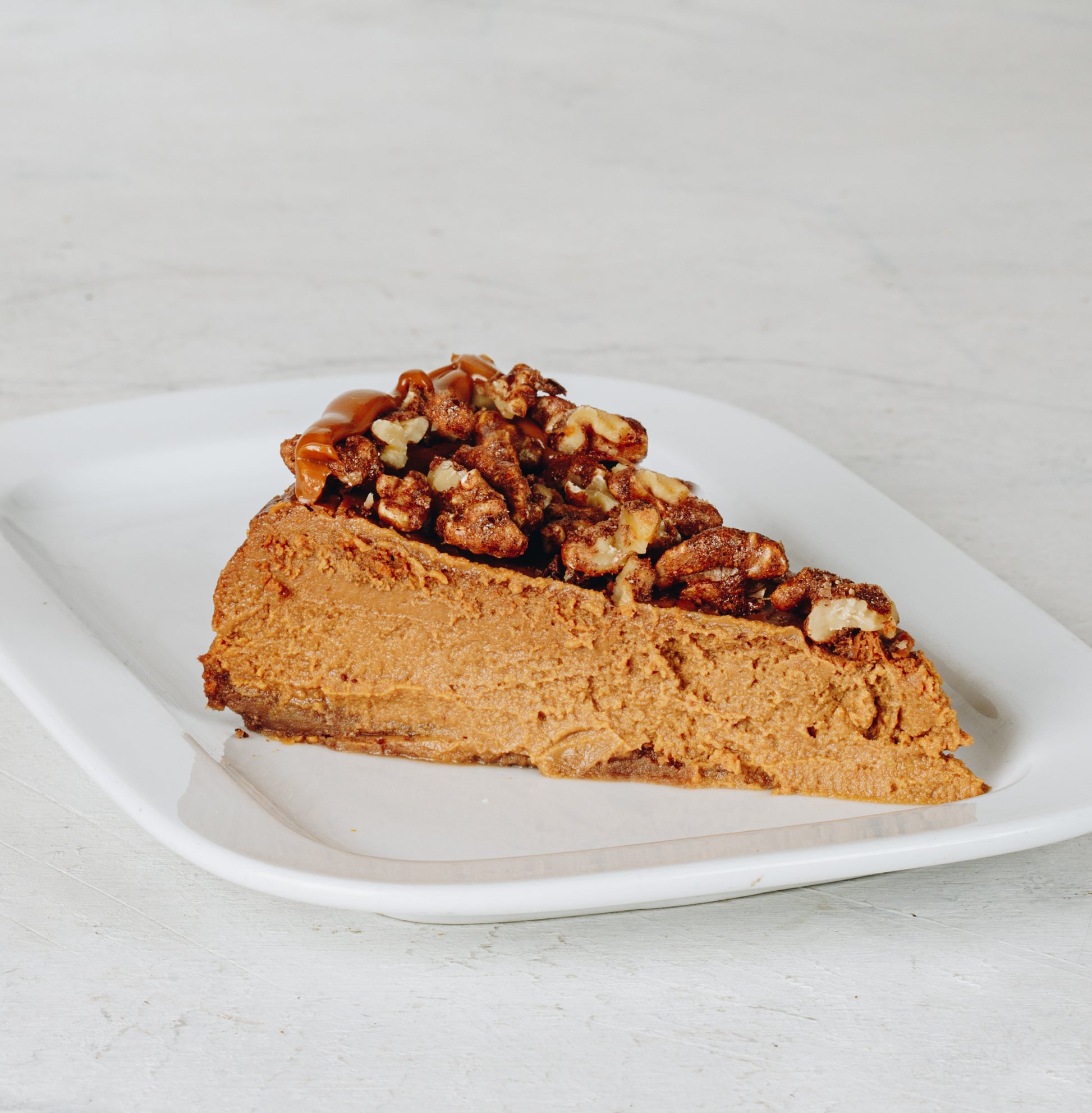 Porción de Emilia, cheesecake de dulce de leche con cobertura de nueces tostadas , sal marina y salsa de dulce de leche.