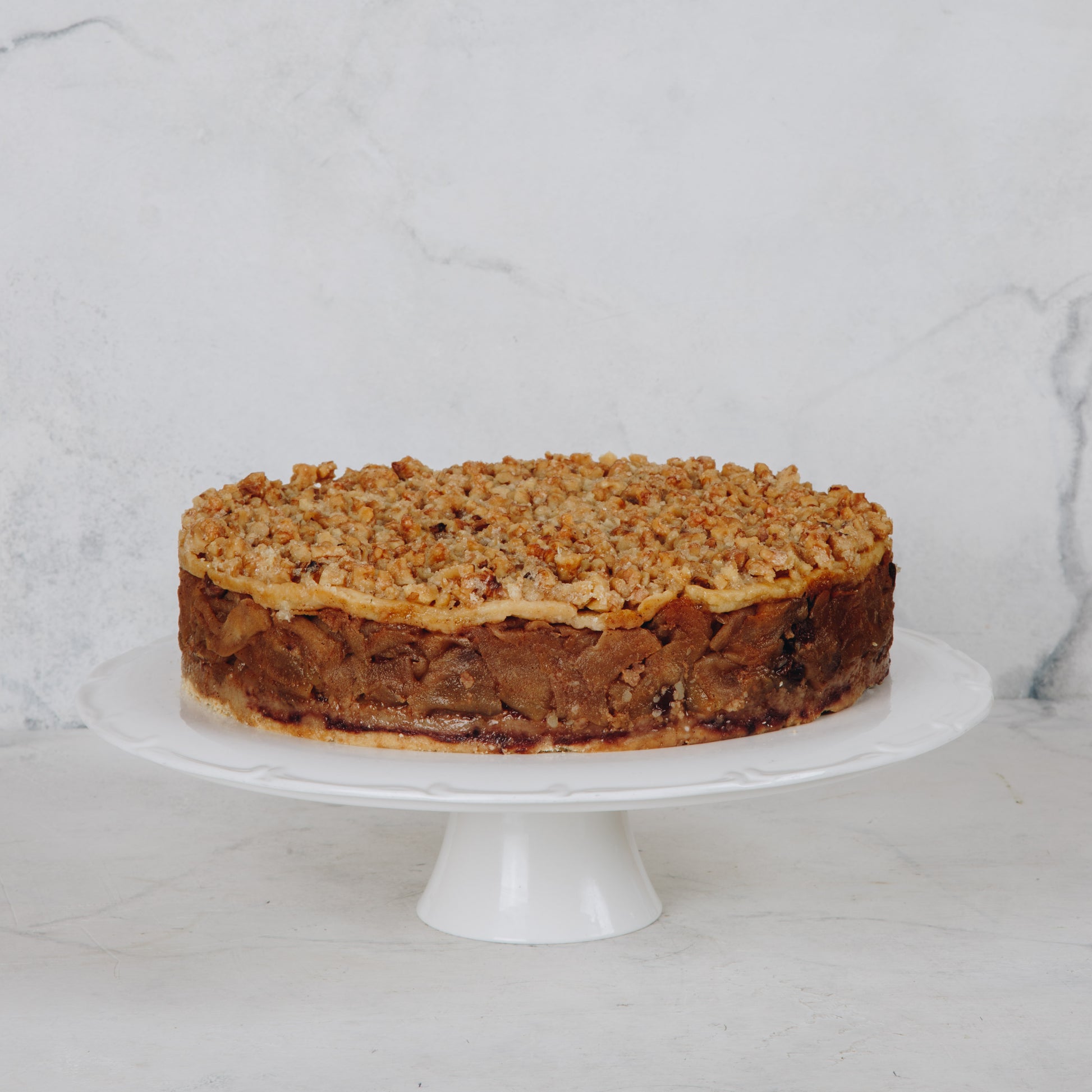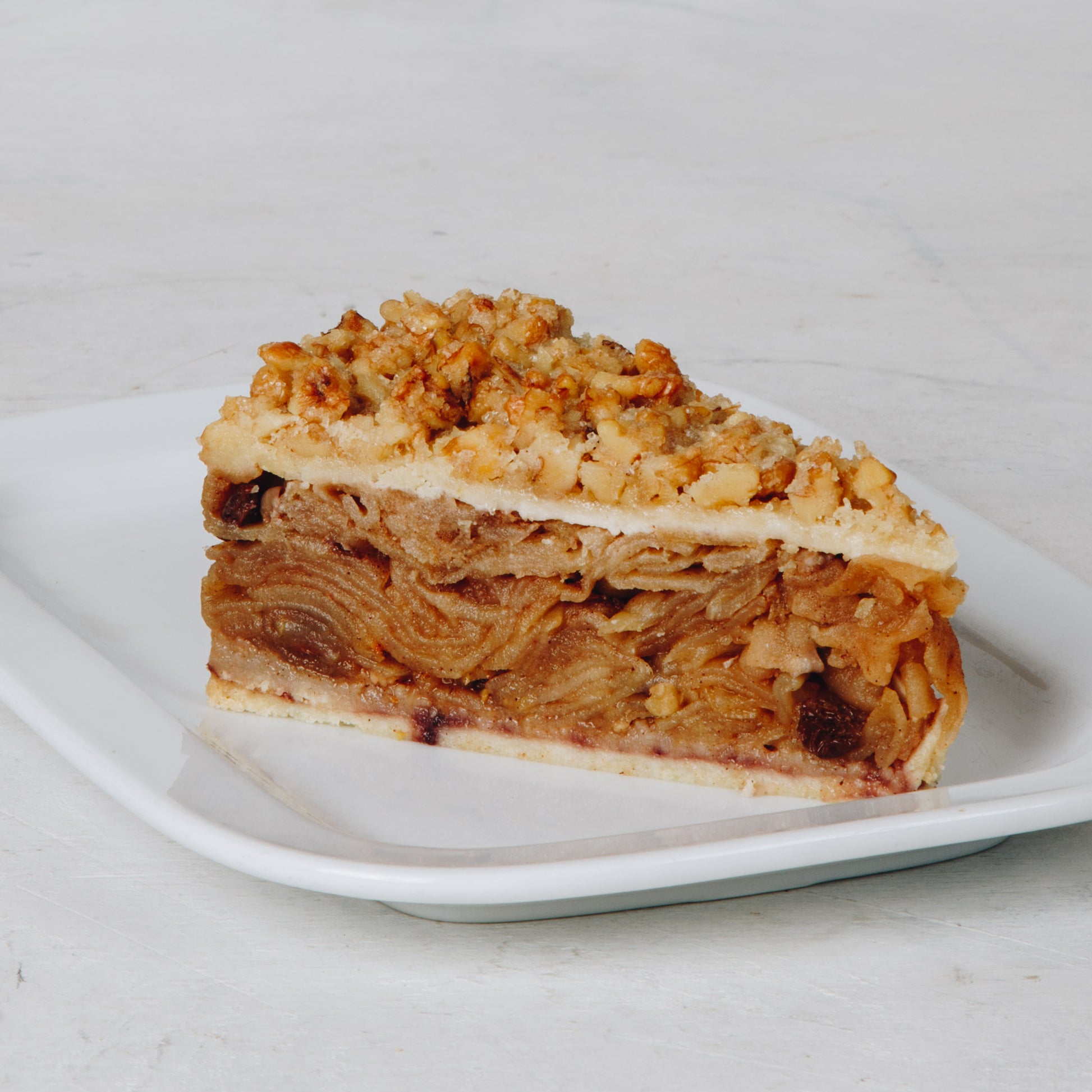 Torta Vera, con masa muy fina, manzanas, pasas de uva negras y crumble de nueces.